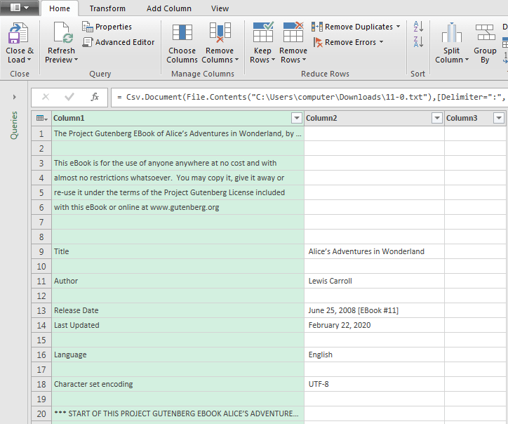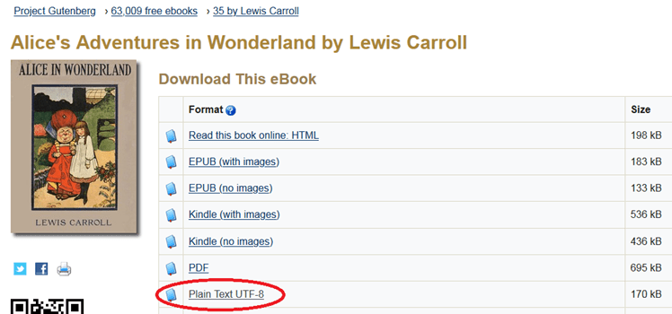 I’m using Alice in Wonderland, which I downloaded from http://www.gutenberg.org/ebooks/11 – the Plain Text version, .txt file format.