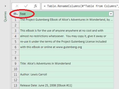 Note: I’ve renamed the Column to “Text” – you can do this by double clicking the Column name, and typing in a suitable name.