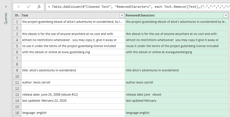 Lets remove all unwanted characters, using the Text.Remove function. These include “.” “,” “#” and so on, including numerical values.