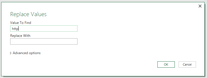 The Replace Values box will now appear. Lets type in the first word, “http”. Leave the Replace With box blank, as want to replace it with a blank.