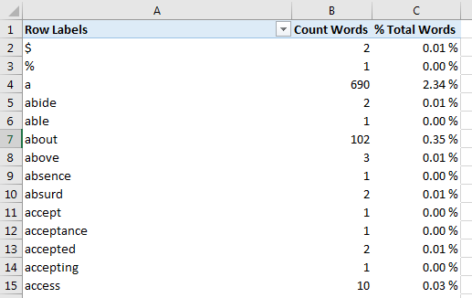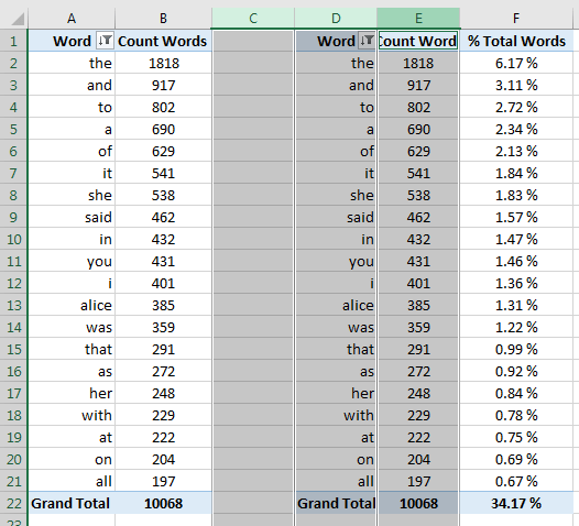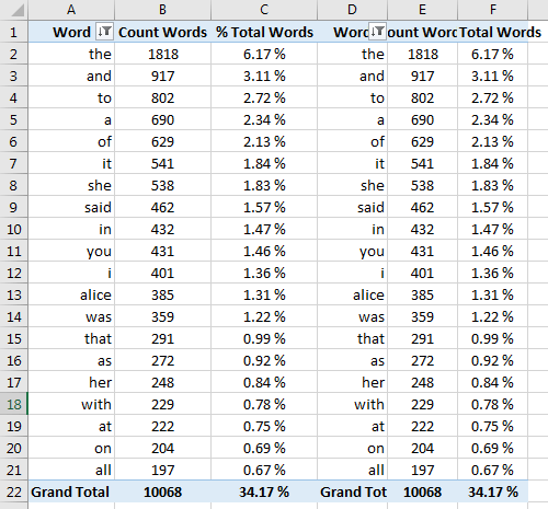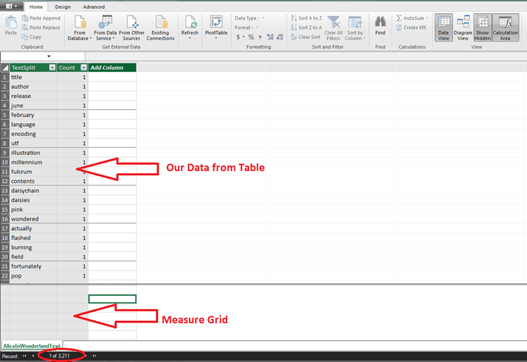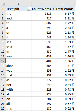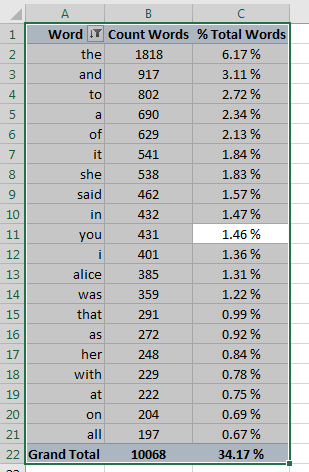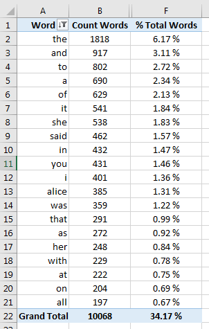 Count Words:=SUM(AliceInWonderlandText[Count])