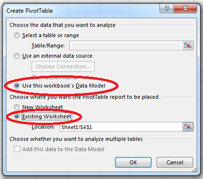 Our Data is stored in the Data Model, hence selecting it to create our PivotTable from. Press ok.