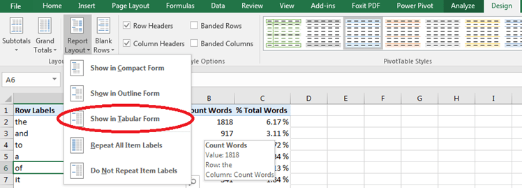 As a rule, whichever Fields are in your PivotTable will appear in your final Chart. However, we don’t want % Total Words to appear in our Chart, but still want it included in the PivotTable. How do we resolve this? By using a workaround. We’re going to use two PivotTables.