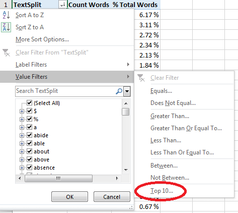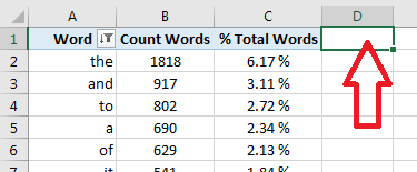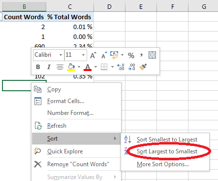 To accomplish this, Right Click on any cell in the Count Words Column, Sort > Sort Largest to Smallest