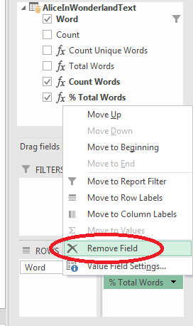 Select the original PivotTable, and in the PivotTable Fields area on the right hand side of the screen, remove the % Total Words Field from the Values box. You can simply drag It away from the box, or click on the small downwards arrow by it and select Remove Field.