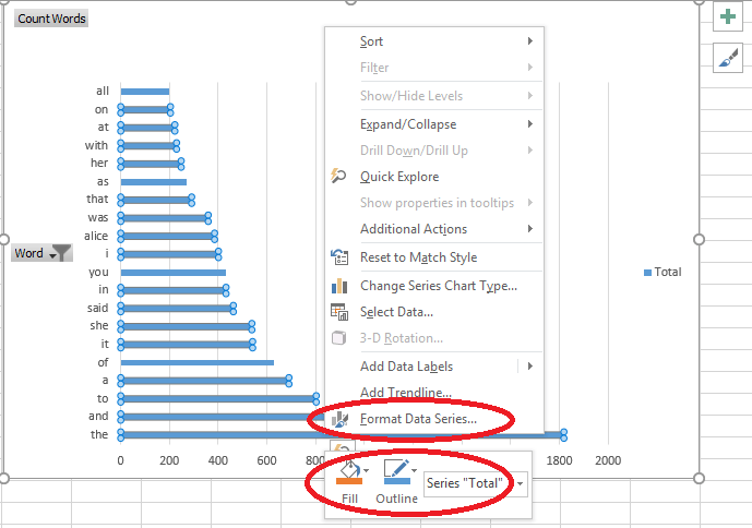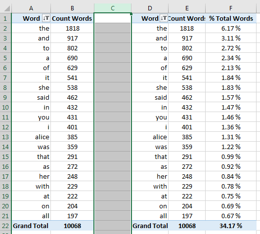 Total Words:=CALCULATE(SUM(AliceInWonderlandText[Count]),ALL(AliceInWonderlandText))