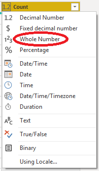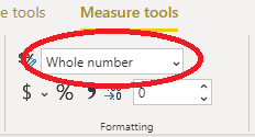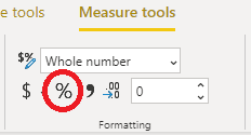To apply number Formatting, select a Measure from the Fields panel, and Select the required Formatting options in Measure Tools > Formatting group.