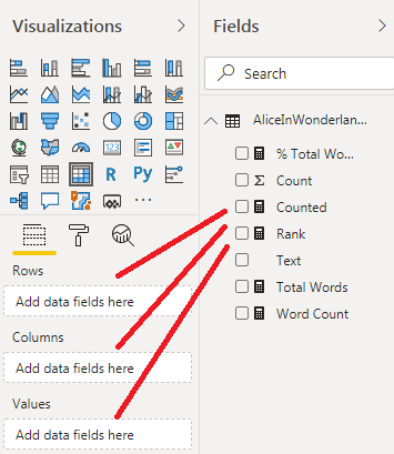 Rank = IF(SELECTEDVALUE(AliceInWonderlandText[Word]) <> “”,RANKX(ALL(AliceInWonderlandText),[Counted],,DESC,Dense),”-“)