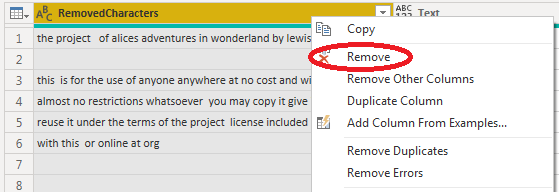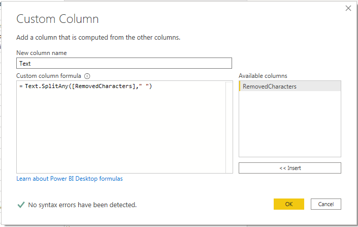 Text.Remove([Text],{“’”,”.”,”-“,”,”,”:”,”;”,”*”,”!”,”‘”,”_”,”[“,”]”,”?”,”=”,”(“,”)”,”/”,”#”,””””,”1″,”2″,”3″,”4″,”5″,