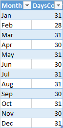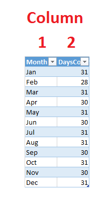 - DaysInMonth[Month] represents the Column we want to search, the Month Column.