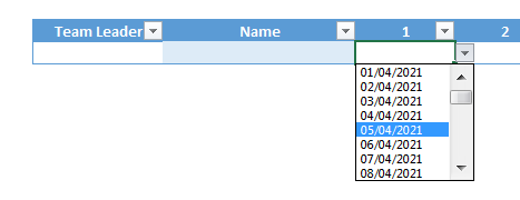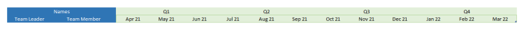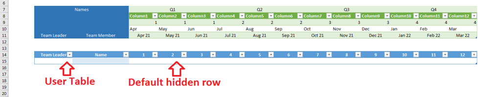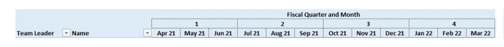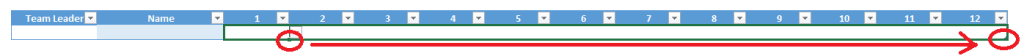 It’s a standard Excel Table with Columns for Team Leader / Team Member, and numbered Columns from 1 to 12 representing each Month of the Fiscal Year.