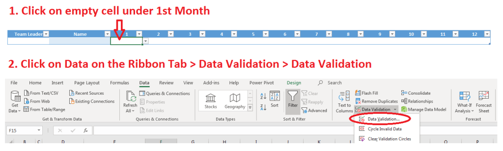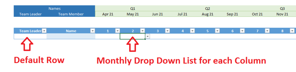 We would like the user to be able to enter a Team Member name in an empty cell and then have Drop Down Lists appear for each Month of the Fiscal Year.