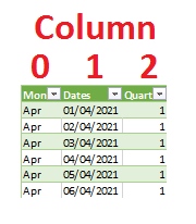 Column 1 is the list of dates. We use Base 0 – so Column 1 is 0, Column 2 is 1, and so on.