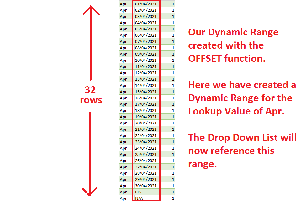 The OFFSET function allows you to create a dynamic range to the Date Table, perfect to construct Drop Down Lists for each of our Months.