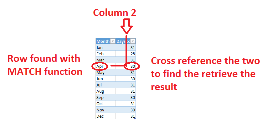 Firsty, we search the Rows of the DaysInMonthTable with the MATCH function.