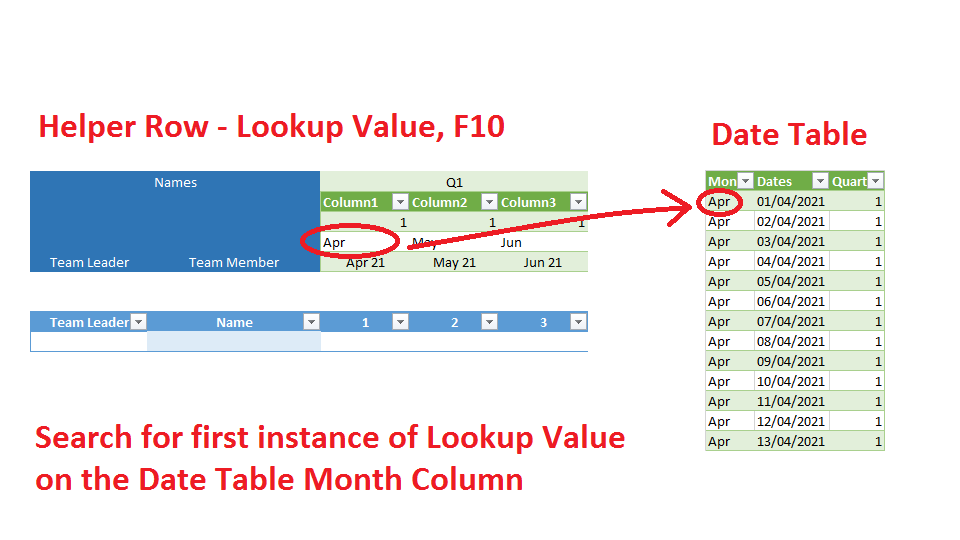 The User Table we created has a Helper Row above each Column which contains a three character shorthand of the respective Month. This is our Lookup Value. Using this we can determine which Row we would like to begin our dynamic range from on the Date Table.