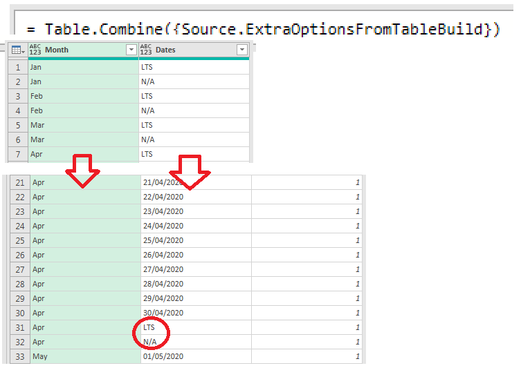 - Combine our Users Extra Options alongside the existing Dates (Combine the ExtraOptionsFromTableBuild query to this query).