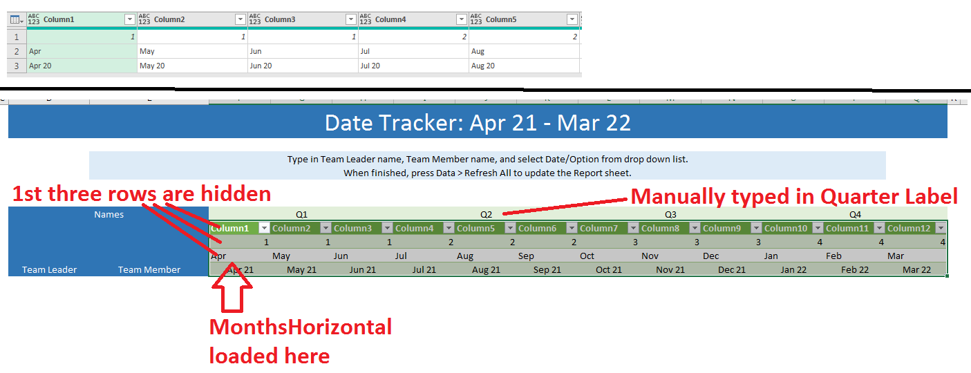 You may recall earlier that we loaded the MonthsHorizontalLabel query onto the Date Tracker sheet as a Table.