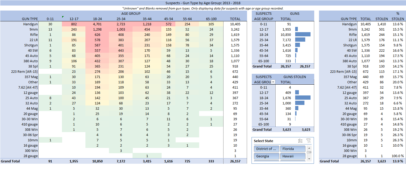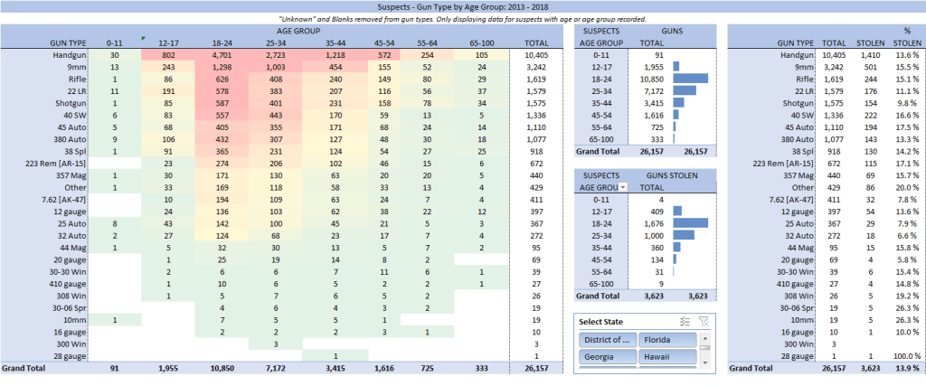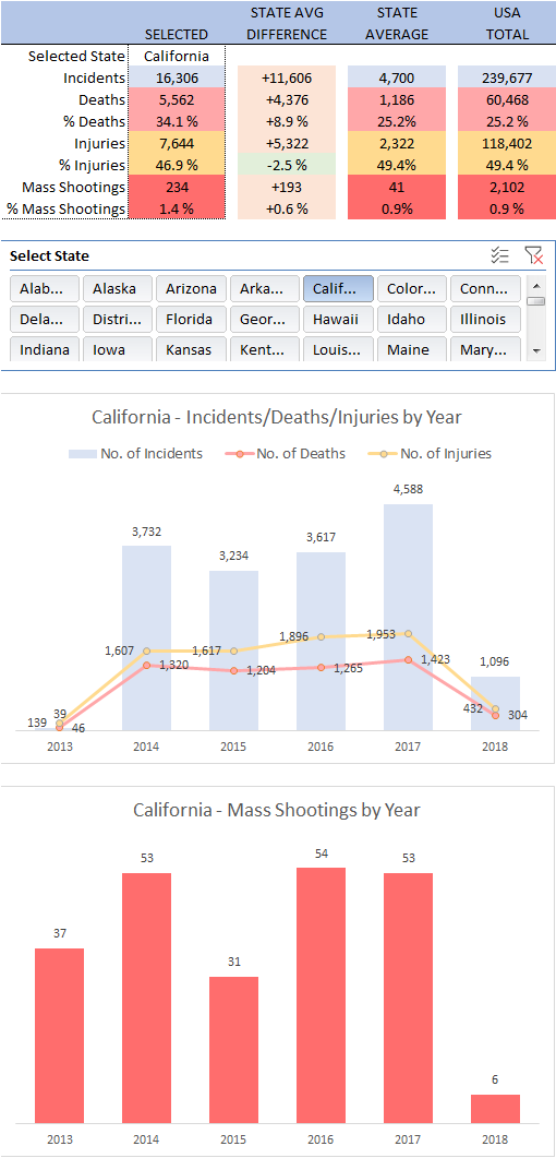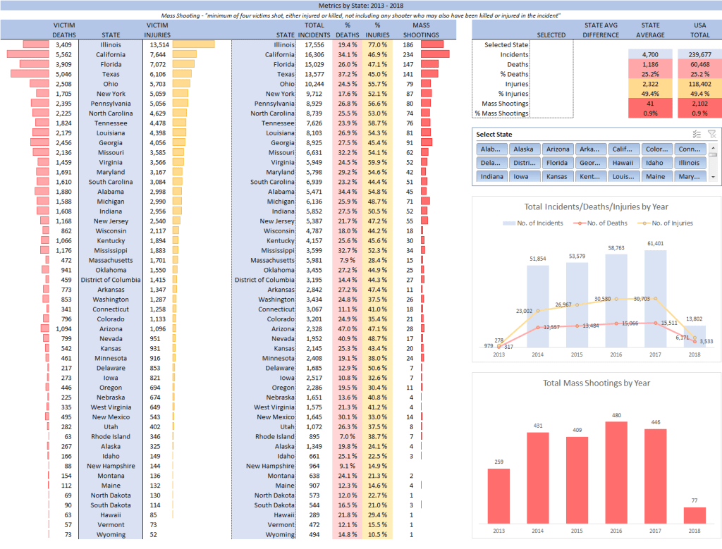 The dataset contains over 260k of gun violence incidents in the USA, from 2013 to 2018. I wanted to analysis and present the data, asking the following questions –