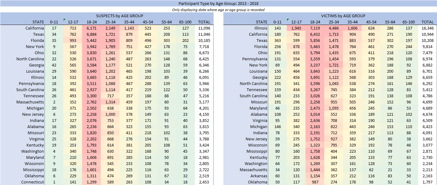 - Which age group accounted for the most suspects/victims?