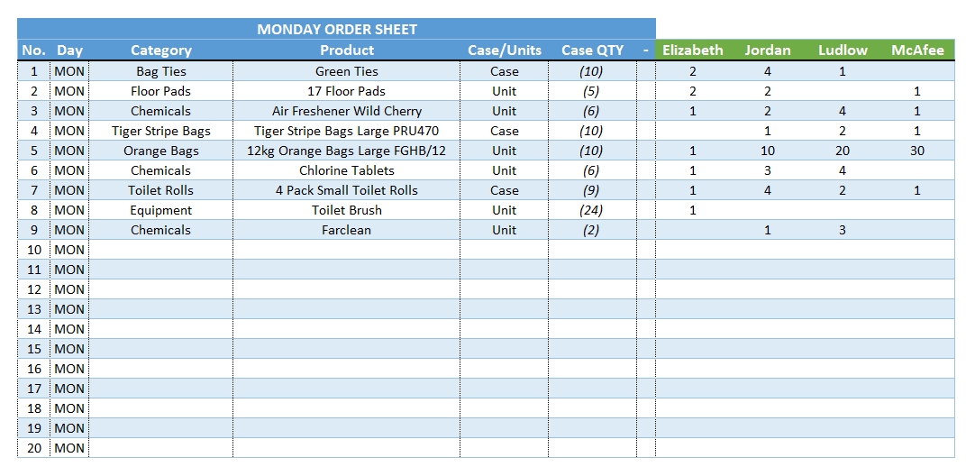 I was introduced to a spreadsheet, which displayed the daily orders of goods to be delivered on each weekday.