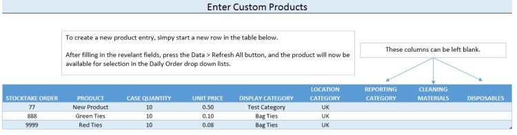 Products can manually be added to the drop down lists if they don’t appear in the Products.csv file. This might be useful for goods that are purchased from different Suppliers.