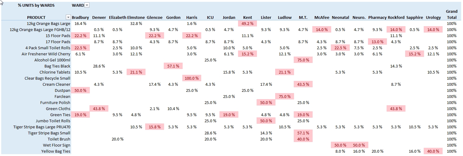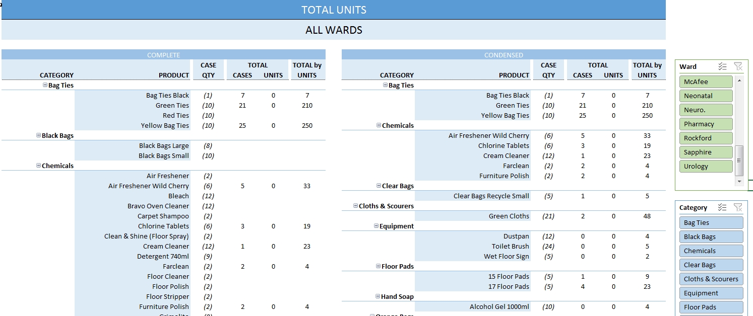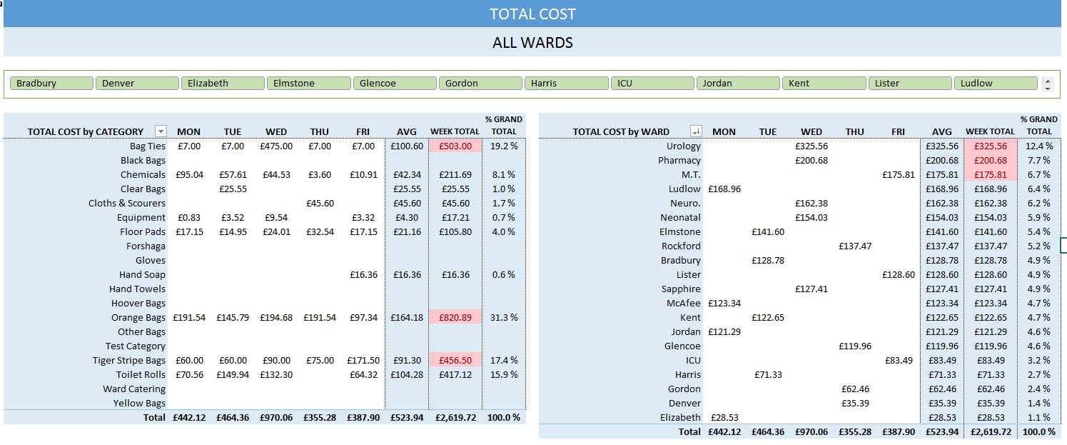 - Total Cost and % of Grand Total – by Ward / Category / Product