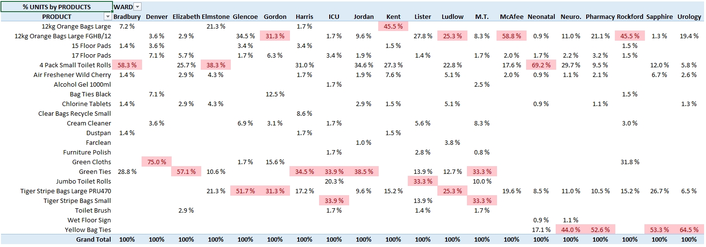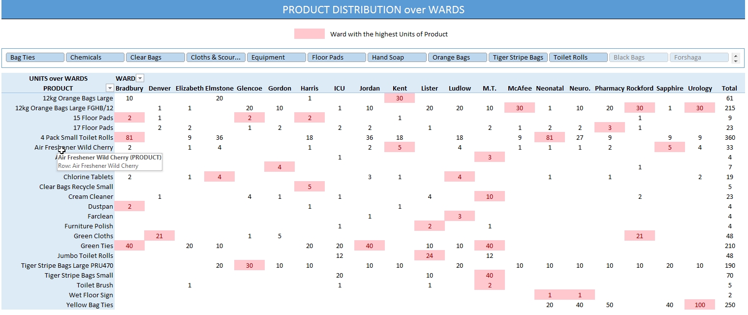 Product Distribution over Wards – to determine which Ward had the highest number of Units for each Product.
