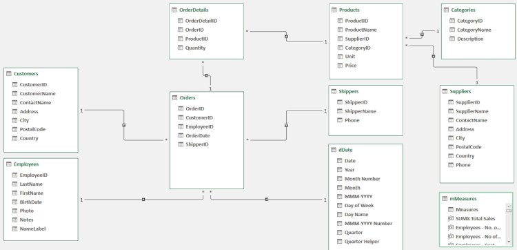 I iterated the OrderDetails table in my calculations, for e.g. to calculate Total Sales I would use the SUMX function to multiple the quantity by the current ProductID’s price. We use the RELATED function to pull the price from the Products table, since we are propagating a Many to One Relationship.