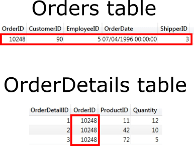 The OrderDetails table represents the multiple line items that make up an Order. Each line item has an unique index, OrderDetailID. Indeed, we can observe the One to Many Relationship between Orders and OrderDetails.