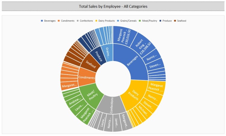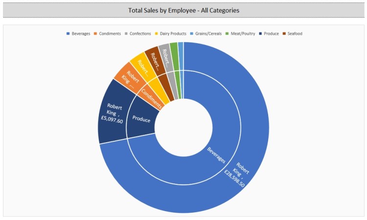 The Sunburst visual gives us an easy to interpret breakdown of categories and total sales. With the use of slicers we can further analyse performance, for e.g. Robert King’s highest proportion of sales are in the beverages category.