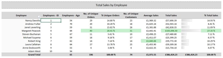 The Employee metrics are analysed via Total Sales and Total Sales per Category measures. We can summarise that Magaret Peacock leads all employees in performance. Despite this, Robert King has the highest average sales.