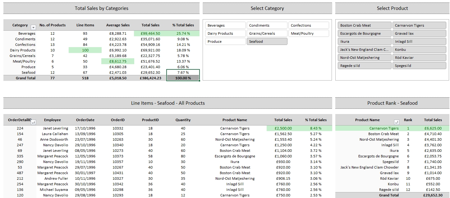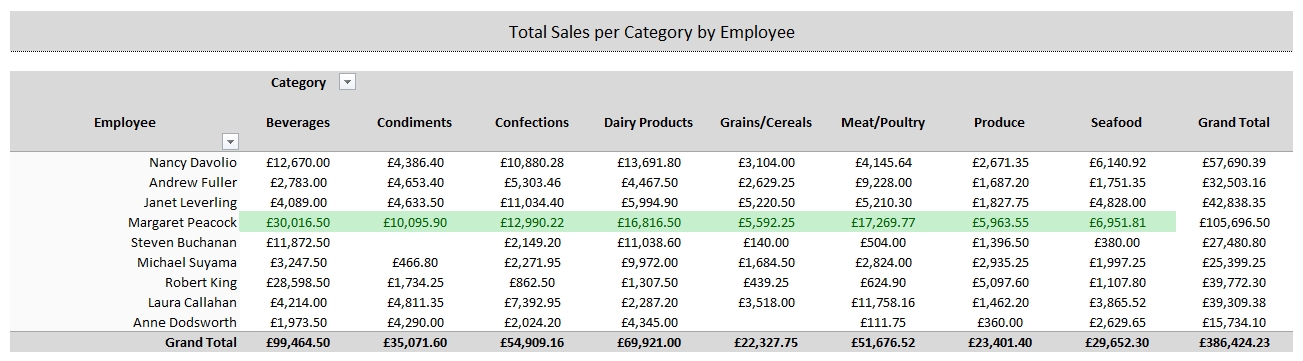 I challenged myself to produce a report from the dataset – focusing on the Employee and Category data.