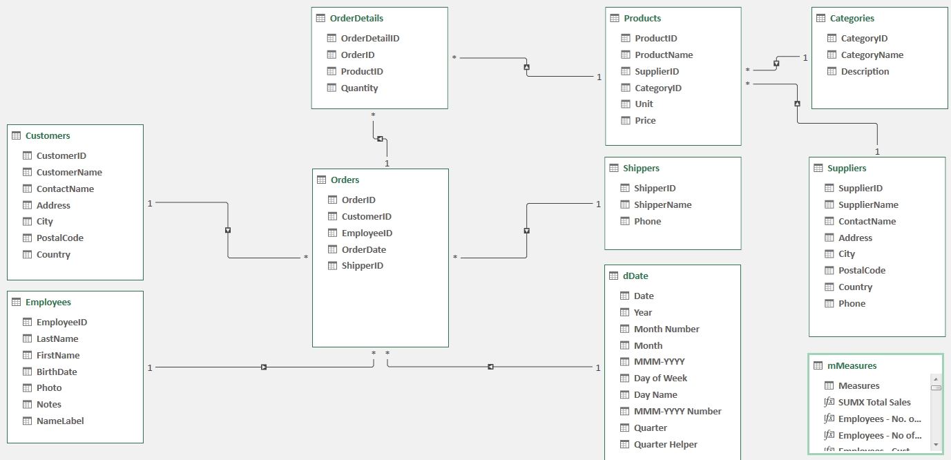 The Customers, Employees, and Shippers tables are dimension tables, which filter the Orders table.