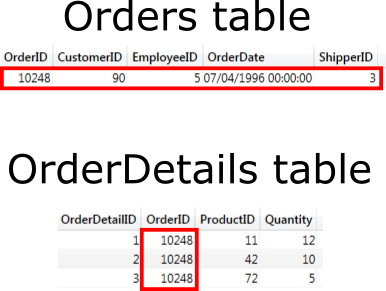 The OrderDetails table represents the multiple line items that make up an Order. Each line item has an unique index, OrderDetailID. Indeed, we can observe the One to Many Relationship between Orders and OrderDetails.