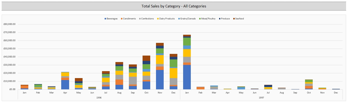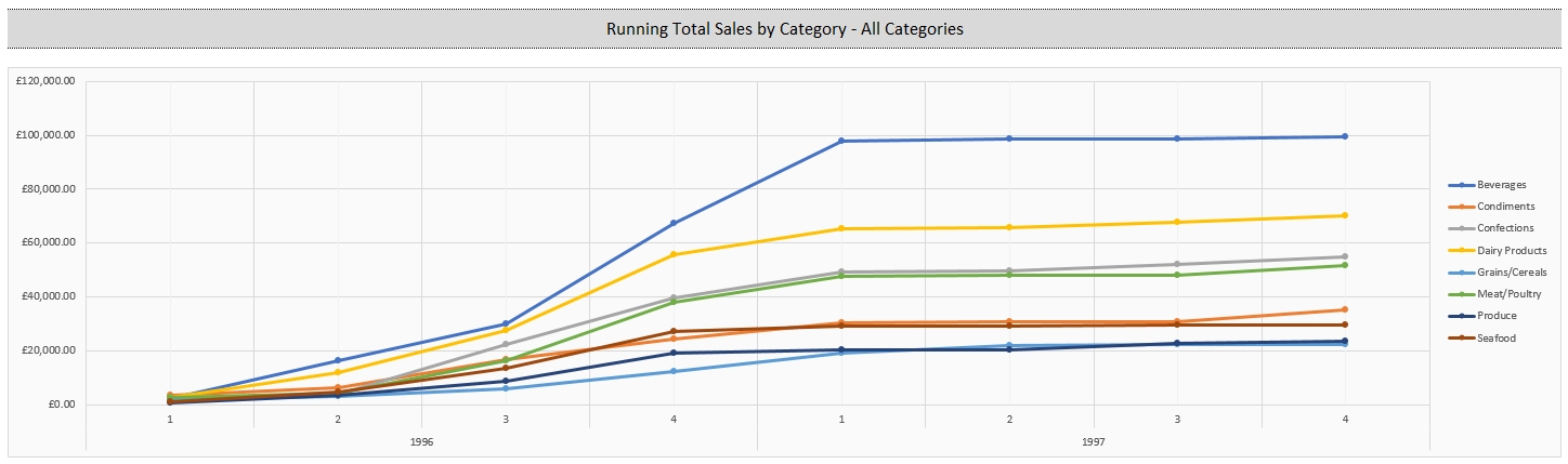 The category sales are analysed with the Running Total Sales and Total Sales by Category measures. We can summarise that the highest period of sales occured during Q2 1996 – Q1 1997, and subsequently levelled off.