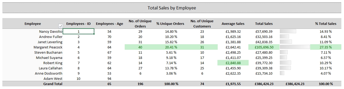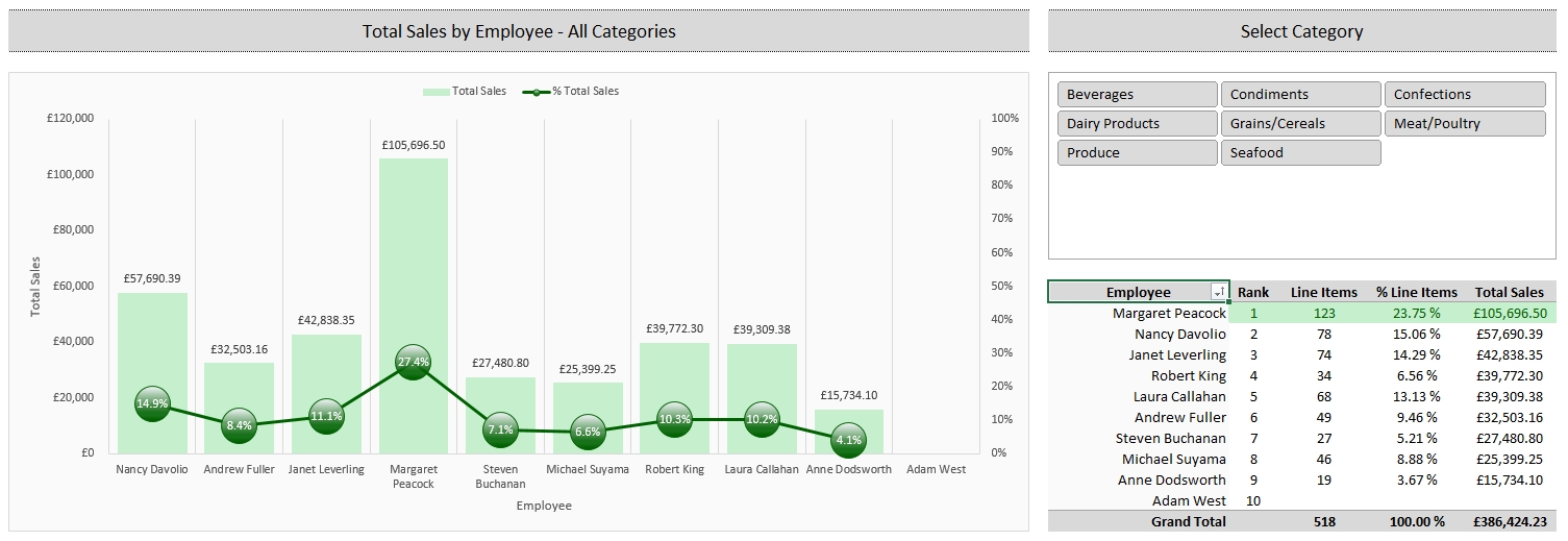 The Employee metrics are analysed via Total Sales and Total Sales per Category measures. We can summarise that Magaret Peacock leads all employees in performance. Despite this, Robert King has the highest average sales.